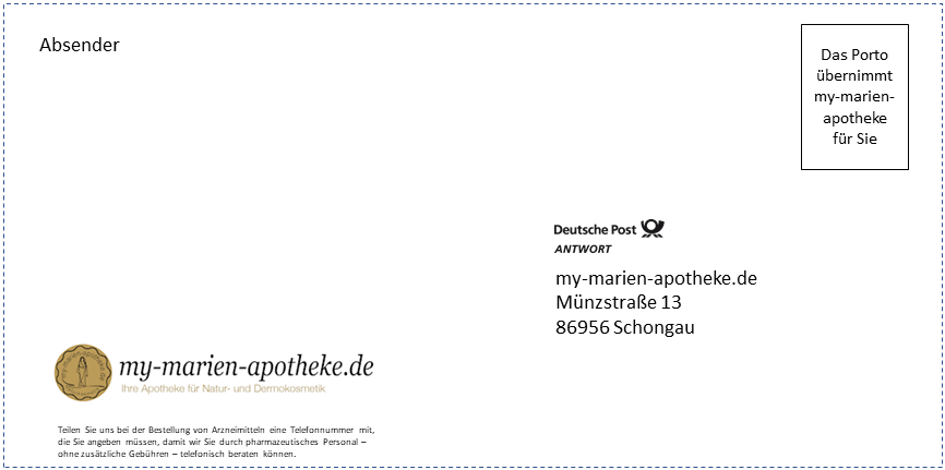Dazu haben wir Ihnen hier einen bereits vorgefertigten Freiumschlag zum Herunterladen hinterlegt. Sie haben keinen Drucker? Das ist kein Problem! Legen Sie uns einen gut lesbaren unterschriebenen Bestellzettel mit dem Rezept in einen frankierten Briefumschlag und wir erstatten Ihnen die Portokosten zurück.