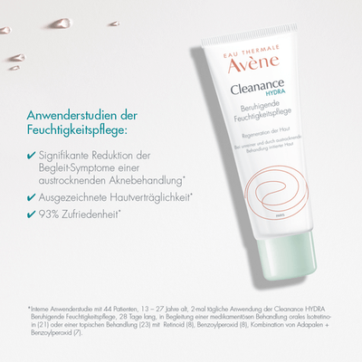 Die Cleanance HYDRA Beruhigende Feuchtigkeitspflege hat feuchtigkeitsspendende und regenerierende Eigenschaften und wirkt somit gegen die hautreizenden Effekte medizinischer Aknebehandlungen.