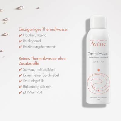 Das Avène Thermalwasser beinhaltet reines Thermalwasser ohne Zusatzstoffe mit hautberuhigenden, reizlindernden und entzündungshemmenden Eigenschaften. Es besteht aus einer mineralischen und biologischen Zusammensetzung. Die mineralische Zusammensetzung umfasst wertvolle Silikate, Kieselerde, Calcium, Magnesium, Natrium und Spurenelemente wie Eisen, Kupfer, Zink und Fluor. Die biologische Zusammensetzung bezeichnet die Mikroflora mit aktiven Substanzen aus dem Avène Thermalwasser.