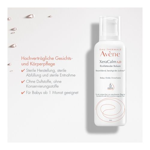 Die Avène XeraCalm A.D Pflegeserie ist speziell für die extrem trockene und zu Neurodermitis neigende Haut konzipiert worden. Sie beruhigt die Haut, wirkt stark rückfettend und lindert den quälenden Juckreiz, unter dem vor allem Neurodermitis-Patienten sehr leiden. Von der Reinigung bis zur Pflege und Intensivpflege bietet Avène XeraCalm A.D genau die richtigen Formulierungen für die angegriffene und strapazierte, trockene Haut. Der Säureschutzmantel wird schnell wiederaufgebaut und die Haut mit Nährstoffen und Feuchtigkeit versorgt. Zusätzlich entspannt der sehr hohe Anteil an Avène Thermalwasser die Haut und beruhigt sie dank der reizlindernden und entzündungshemmenden Eigenschaften. Alle Produkte haben hochverträgliche Formulierungen, um das Risiko von allergischen Reaktionen zu minimieren. Durch die sterile Herstellung und die sterile Entnahme aufgrund des sterilen Verschlusses bei Creme, Balsam und Anti-Juckreiz Konzentrat wird der Tubeninhalt zusätzlich vor eindringenden Keimen geschützt und somit kann auf Konservierungsstoffe und Duftstoffe verzichtet werden. Eine maximale Hautverträglichkeit ist garantiert.