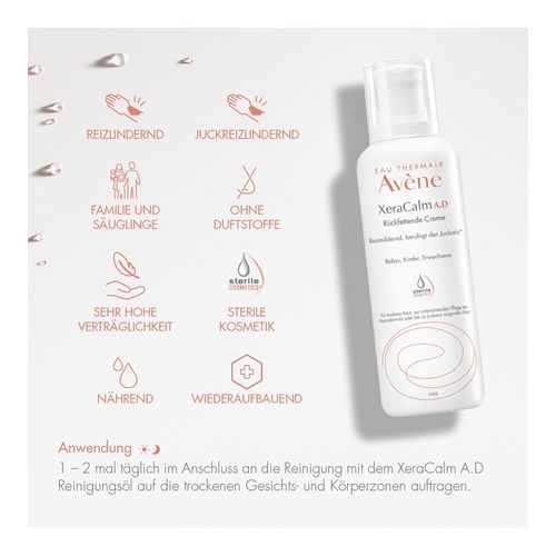 Die Avène XeraCalm A.D Creme zeichnet sich durch ihren sterilen Pumpspender aus, der eine einfache Dosierung und hygienische Entnahme ermöglicht und für eine hohe Verträglichkeit sorgt. Die hochverträgliche Gesichts- und Körperpflege ist bereits für Babys ab 1 Monat geeignet. Die Creme wird steril hergestellt sowie abgefüllt und ist ohne Duft- und Konservierungsstoffe. Besonders ist die Creme bei trockener Haut, atopischen Hautzuständen, zu Neurodermitis neigender Haut oder Altersxerose geeignet.