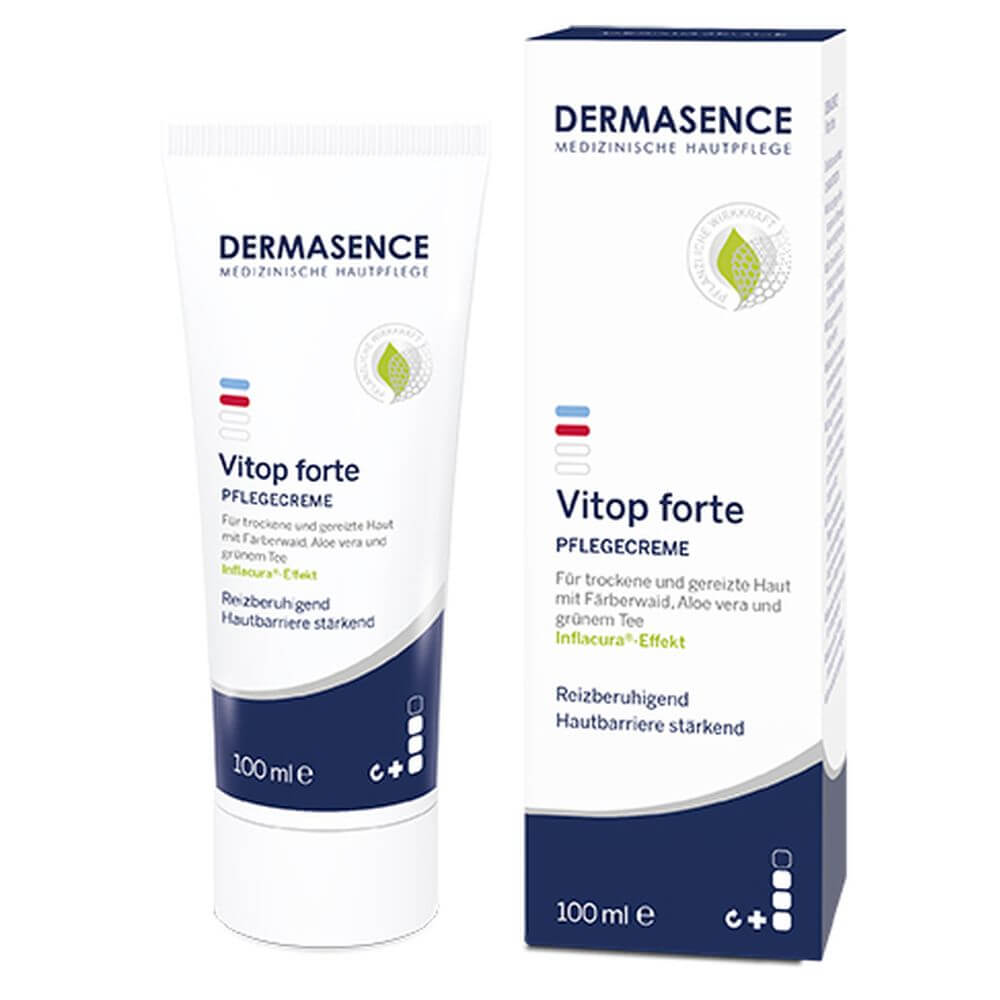 Ruhe für die Haut durch die wiederentdeckte Naturkraft der Waidpflanze. DERMASENCE Vitop forte mindert Hautreizungen, Juckreiz und Schwellungen trockener und irritierter Haut. Die Pflegecreme ist ideal bei trockener und zu Neurodermitis neigender Haut. Mit ihrem hautverträglichen Aktiv-Komplex aus Waid, Aloe vera und Grünem Tee kann DERMASENCE Vitop forte bei regelmäßiger Anwendung Entzündungssymptomen wirksam vorbeugen. Die Pflegecreme bildet einen atmungsaktiven Schutzfilm auf der Haut, der vor mechanischen Reizen schützt. Ihre Haut kommt zur Ruhe.