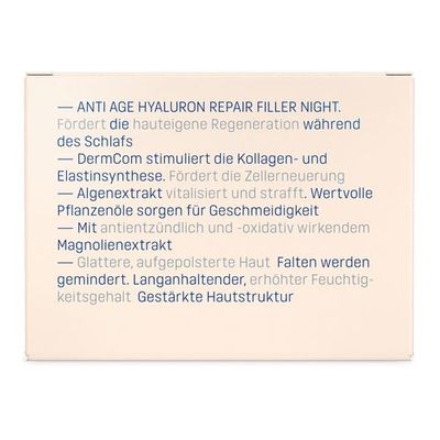 Bei regelmäßiger Anwendung wird die Haut von innen 3-dimensional – in der Fläche wie auch in der Höhe und Tiefe – gestrafft und aufgepolstert. Der Feuchtigkeitsgehalt erhöht sich intensiv und langanhaltend. Die hauteigene Regeneration wird während der nächtlichen Ruhephase unterstützt, Falten mindern sich und die Haut wird sichtbar glatter und straffer – für ein gepflegtes jüngeres Aussehen.