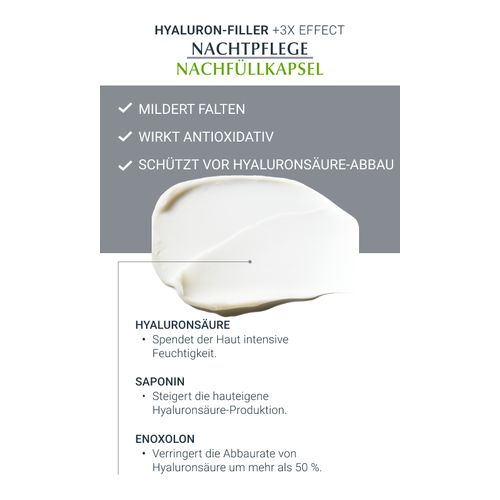 Die Eucerin HYALURON-FILLER + 3 x Effect Nacht Nachfüllkapsel ist die umweltfreundliche Alternative zum Kauf von neuen Cremetiegeln. Die Anti-Falten-Creme mit feuchtigkeitsspendender Hyaluronsäure und Enoxolon füllt selbst tiefe Falten von innen heraus auf. Zugleich kurbelt bioaktives Saponin die hauteigene Hyaluronsäure Produktion an und Dexpanthenol unterstützt die Hautregeneration in der Nacht. So sorgt die nicht komedogene Eucerin Creme gegen Falten für spürbar glattere, strahlendere und jünger wirkende Haut.