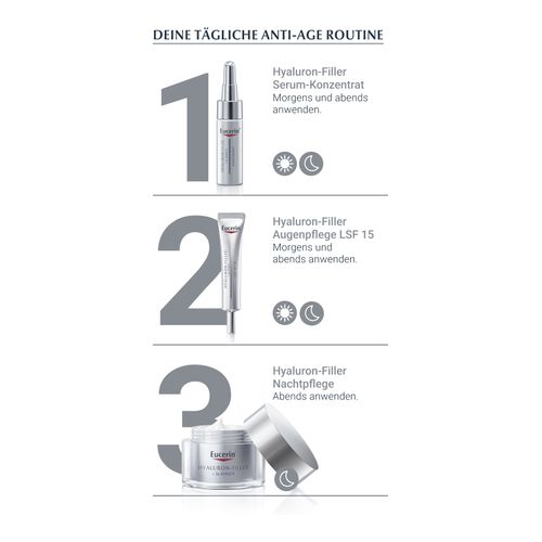 - Die Hyaluron-Filler + 3x Effect Nachtpflege und Augenpflege LSF 15 auftragen. Falls auch das Hyaluron-Filler + 3x Effect Serum-Konzentrat verwendet wird, dieses vor der Nachtpflege auftragen. Dann die Pflege sanft in die Haut einmassieren.