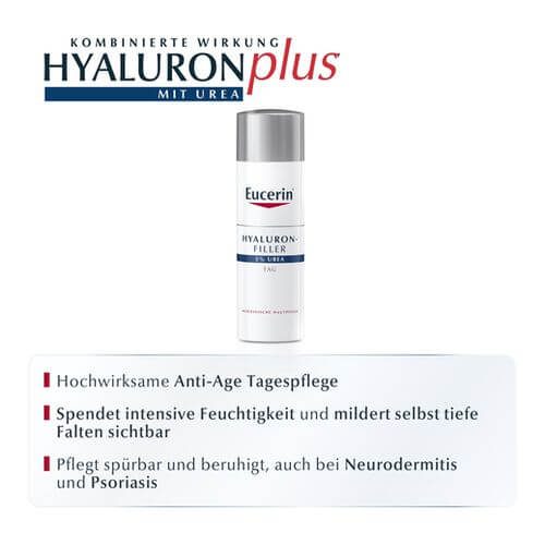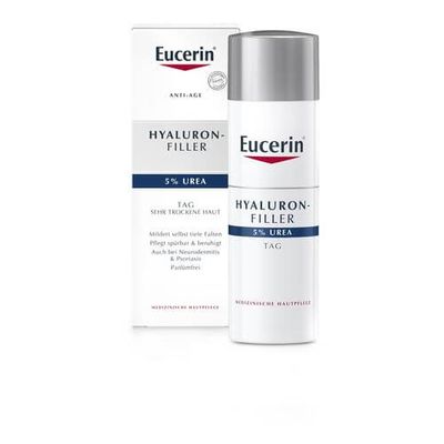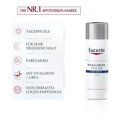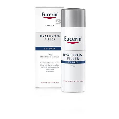 Die Eucerin Hyaluron-Filler Urea Tagespflege wirkt Falten entgegen, die durch Austrocknen der Haut entstehen. Die einzigartige Kombination von 5% Urea mit lang- und kurzkettiger Hyaluronsäure spendet intensive Feuchtigkeit und mildert selbst tiefe Falten sichtbar. Die schnell einziehende Textur beruhigt auch problematische Haut und verleiht ein geschmeidiges Hautgefühl.Hohe UVA-Filter schützen außerdem vor lichtbedingter Hautalterung.