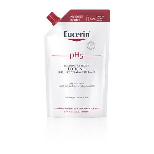 Eucerin pH5 Lotion F ist eine sanfte, aber wirksame Körperpflege, die speziell entwickelt wurde, um empfindliche, trockene Körperhaut widerstandsfähiger und weniger empfindlich zu machen. Das einzigartige Eucerin pH Balance System mit dem pH5 Citratpuffer stellt den natürlichen pH-Wert der Haut wieder her. Gleichzeitig hilft 3% Dexpanthenol die Regeneration der Haut zu stimulieren und deren Widerstandskraft zu bewahren.