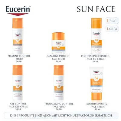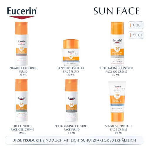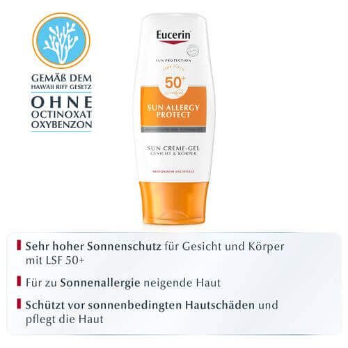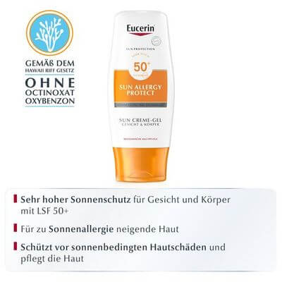 Das Eucerin Sun Allergy Protect Sun Creme-Gel mit LSF 50 bietet hohen Sonnenschutz und schützt vor Sonnenallergien und sonnenbedingten Hautschäden. Der Sonnenschutz mit ADVANCED SPECTRAL TECHNOLOGY sorgt für einen zuverlässigen Schutz vor UVA/UVB-Strahlung und bei hochenergetisch sichtbarem Licht  (HEV-Licht). Die Sonnencreme eignet sich besonders für Hauttypen, die zu Sonnenallergie wie PLD (Polymorphe Lichtdermatose) neigen. Zusätzlich schützt  das in der Sonnencreme enthaltene Glucosylrutin vor sonnenbedingten Allergien. Die unparfümierte Formel senkt dabei das Risiko für Hautirritationen. Beim Auftragen klebt die Creme nicht, ist nicht fettend, schnell einziehend sowie wasserfest.