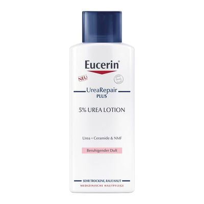 Die Eucerin UreaRepair PLUS Lotion 5% mit beruhigendem Duft ist eine hochwirksame Pflegecreme bei sehr trockener, rauer und gespannter Haut. Mit der Körperlotion wird die Haut 48 Stunden langanhaltend vor Trockenheit geschützt und die Anzeichen trockener Haut werden gelindert. Als Wasser-in-Öl Emulsion zieht die leichte Lotion schnell ein, macht die Haut glatt sowie geschmeidig und stärkt ihre Widerstandskraft.