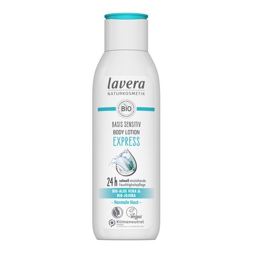 Die basis sensitiv Bodylotion Express mit Bio-Aloe Vera & Bio-Jojobaöl bietet 24 Stunden schnell einziehende Feuchtigkeitspflege für normale Haut.