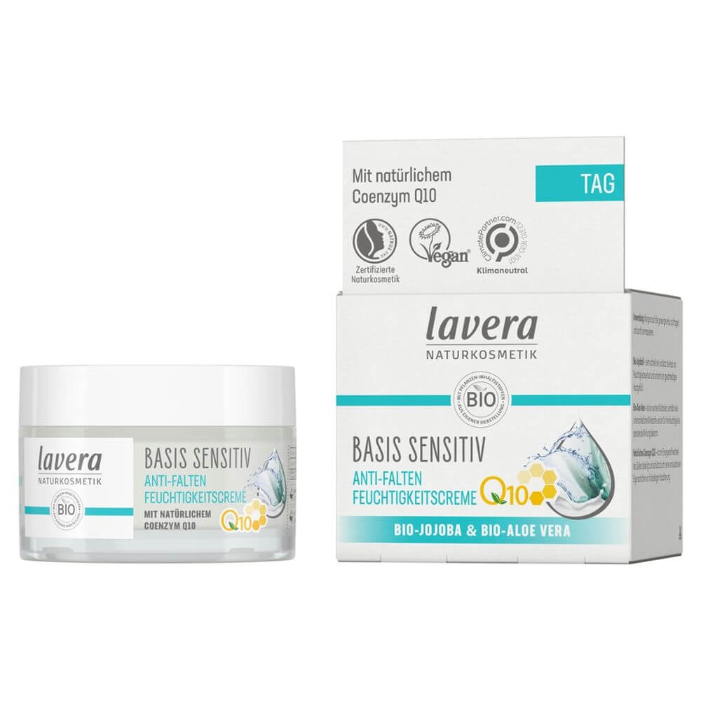 Für ein optimales Pflegeergebnis verwende auch die anderen Produkte unserer basis sensitiv Anti-Falten-Serie mit natürlichem Coenzym Q10: Anti-Falten Nachtcreme Q10, Anti-Falten Augencreme Q10 und Anti-Falten Maske Q10.