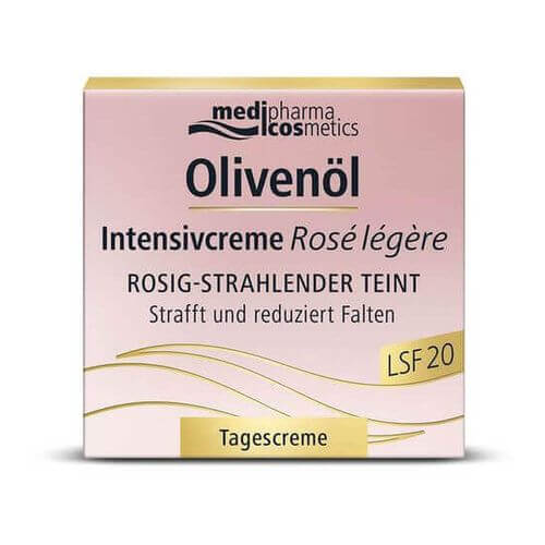 Die Olivenöl Intensivcreme Rosé légère von Medipahrma Cosmetics mit ihrer sorgfältig abgestimmten Komposition aus hochwertigem Pflegeöl, wertvoller Hyaluronsäure und Vitamin A glättet und reduziert Falten. Der zusätzliche LSF 20 schützt vor sonnenbedingter Hautalterung und der Oxy-Activ-Komplex auf mineralischer Basis unterstützt die Sauerstoffaufnahme der Haut, belebt sie so und schenkt ihr neue Straffheit und Vitalität.
