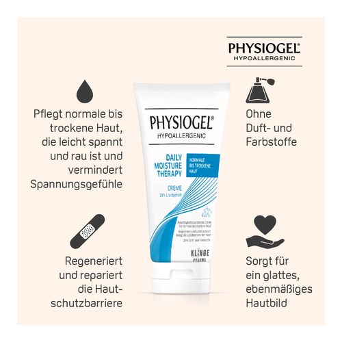 PHYSIOGEL® Daily Moisture Therapy Creme für normale bis trockene Haut pflegt mit dem 3-fach Effekt: feuchtigkeitsspendend, regeneriert und repariert. Auch geeignet bei trockener Haut aufgrund Diabetes oder Hauttrockenheit durch Kompressionsstrümpfe