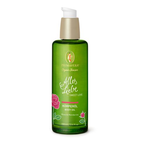 Tauche ein in duftende Wohlfühlwelten und erlebe die pure Kraft der Natur. Das harmonisierende Körperöl Alles Liebe ist eine Komposition naturreiner Pflanzenextrakte mit Bio Mandelöl, Bio Jojobaöl und Bio Sesamöl. Nach dem Duschen oder Baden in die feuchte Haut massiert pflegt es und nährt die Haut langanhaltend. Genieße die Wertschätzung für Deinen Körper, die liebevolle Leichtigkeit und das Gefühl seidig-weicher Haut. Erlebe den sinnlich-frischen Duft aus Bio Rose und Bio Mandarine, der Dich umhüllt und Deine Sinne verwöhnt, und Dir pure Harmonie und Freude schenkt. Das Körperöl Alles Liebe ist ein sinnliches Dufterlebnis und schafft einzigartige Wohlfühlmomente für Dich.