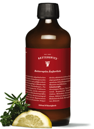 Dass physikalische Anwendungen wirken, wusste schon Hildegard von Bingen. In der modernen Physiotherapie gehören Wasseranwendungen, z. B. als Wickel, heute zur Standardbehandlung. Reine ätherische Öle in Retterspitz Äußerlich unterstützen die bewährte Hydrotherapie. Die medizinische Wickellösung enthält beispielsweise den Naturheilkunde-Klassiker Arnikatinktur. Die Gebirgspflanze wird traditionell bei stumpfen Verletzungen, Muskelschmerzen und Venenbeschwerden eingesetzt. Das in Retterspitz Äußerlich enthaltene Thymol hemmt Entzündungen, Rosmarinöl lässt rheumatische Beschwerden leichter abklingen und bessert Durchblutungsstörungen. Die spezielle Kombination der verwendeten pflanzlichen Inhaltsstoffe ermöglicht ein breites Anwendungsspektrum und eignet sich deshalb nicht nur für die Hausapotheke, sondern auch für den Einsatz im Profisport oder in Kliniken.