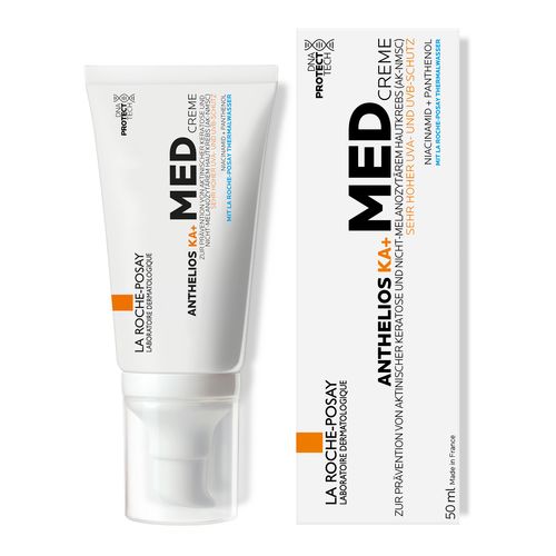 Anthelios KA+ MED Creme ist eine Sonnencreme, die bei der Vorbeugung von sonnenbedingten DNA-Schäden hilft. Die Creme mit Niacinamid und Panthenol schützt die Hautschutzbarriere. Die hochwirksame Sonnencreme  zur Prävention aktinischer Keratose (AK) und nicht-melanozytärem Hautkrebs (NMSC) schützt die Haut dank MEXORYL SX und MEXORYL XL vor UVA- und UVB-Strahlen.