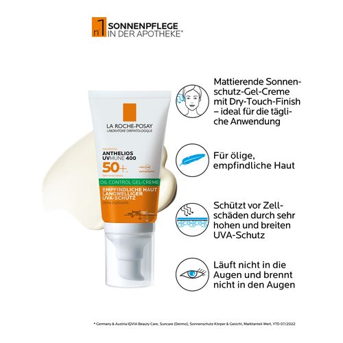 Die Sonnencreme fürs Gesicht wurde speziell für ölige Haut entwickelt und mildert störendes Hautglänzen. Dank der Formel mit AIRLICIUM-Technologie wird überschüssiger Talg absorbiert. Die ANTHELIOS UVMUNE 400 Oil Control Gel-Creme LSF 50+ verfügt über eine leichte Gel-Textur, die besonders schnell einzieht. Die mattierende Sonnencreme lässt sich gut verteilen und brennt nicht in den Augen. Der Sonnenschutz für ölige Haut kommt ohne Dufstoffe aus und kann auch bei empfindlicher Haut verwendet werden.