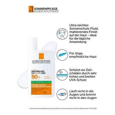 Das ANTHELIOS UVMUNE 400 Oil Control Fluid LSF 50+ von La Roche Posay bietet Sonnenschutz für ölige Haut und verfügt über eine ultra-leichte Fluid-Textur. Das Sonnenfluid fürs Gesicht lässt sich leicht auf der Haut verteilen und brennt nicht in den Augen. Die transparente Formel hinterlässt keine weißen Rückstände auf der Haut und ist wasserfest- sowie schweißresistent. Das ANTHELIOS UVMUNE 400 Oil Control Fluid LSF 50+ bietet dank der innovativen Filtertechnologie Mexoryl 400 hohen Schutz vor UVB- sowie langwelligen UVA-Strahlen. Gleichzeitig verfügt die Sonnencreme für ölige Haut über einen mattierenden Effekt für bis zu 12 Stunden. Überschüssiger Talg wird dank der AIRLICIUM-Technologie absorbiert.