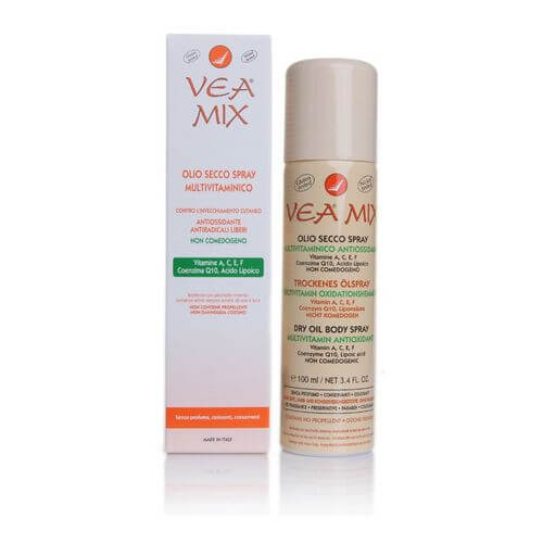 Es enthält kein Wasser, keine Duft-, Farb- und Konservierungsstoffe, um Allergien zu minimieren. ANWENDUNGSBEREICHE: zur Vorbeugung und Reduzierung von Hautschäden durch freie Radikale unter verschiedenen dermatologischen Bedingungen. Zur Reduzierung sonnenbedingter Hautalterung. Zur Pflege von trockener und geröteter Haut. After-Sun. Feuchtigkeitsspendend nach der Dusche oder dem Bad. Kann Dehnungsstreifen vorbeugen und mildern. Kundenempfehlung: Die Anwendung von Vea Mix ist die gleiche wie für Vea Spray, doch als multivitamines, oxidations-hemmendes Ölspray hilft es, die Zeichen der Hautalterung effektiver zu bekämpfen
