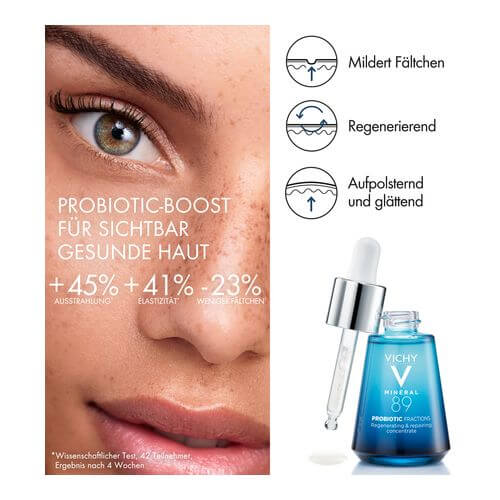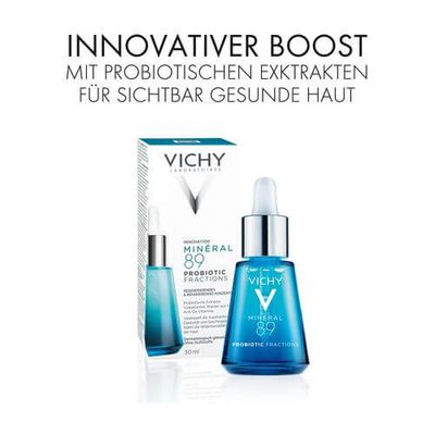 Das MINÉRAL 89 Probiotic Fractions regenerierender & reparierender Booster von Vichy unterstützt und regeneriert intensiv die Hautimmunität. Dank seiner reichhaltigen Formel mit probiotischen Extrakten, welche reich an Vulkanischem Wasser aus Vichy sind, beschleunigt es auf natürliche Art und Weise die sichtliche Erholung der Haut und macht sie spürbar widerstandsfähiger. Die Formel des glättenden Serums enthält zudem Niacinamid, was dabei hilft, den transepidermalen Wasserverlust zu mildern und die Haut so glatter, strahlender sowie elastischer zu machen.