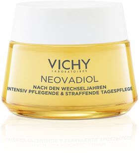 Die reichhaltige NEOVADIOL Magistral Intensiv Pflegende & Straffende Tagespflege von Vichy wirkt dem Straffheits- und Lipidverlust entgegen, indem sie die Lipidspeicher der Haut auffüllt und Anzeichen der hormonell bedingten Hautalterung mildert. Dank des Anti-Aging-Wirkstoffkomplexes mit Proxylane, Omega-Fettsäuren und Niacinamide mildert die Gesichtspflege Falten, strafft die Haut und hinterlässt ein geschmeidiges Hautgefühl.