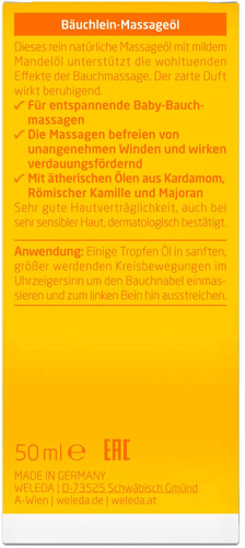 Wenn das Baby schreit, will es oft einfach seine Stimme benutzen oder mitteilen, dass es Kontakt sucht. Es könnte aber auch sein, dass es an Blähungen leidet: Die Verdauungsorgane passen sich erst allmählich an die Lebensbedingungen außerhalb des Mutterleibes an. Das Weleda Bäuchlein-Massageöl, eine fein abgestimmte Komposition auf Grundlage von mildem Mandelöl, ist gezielt konzipiert für entspannende Bauchmassagen. Die natürlichen ätherischen Öle von Majoran, römischer Kamille und Kardamom werden traditionell zur Verdauungsförderung eingesetzt. Eine vorbeugende, sanft pflegende Bauchmassage mit dem Bäuchlein-Massageöl kann vor unangenehmen Winden bewahren. Die regelmäßige Anwendung hilft dem Kind zudem, einen festen Lebensrhythmus zu finden, den es für eine harmonische Entwicklung braucht.