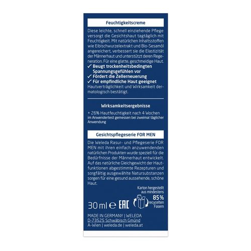 Weleda For Men Feuchtigkeitscreme ist eine leichte Feuchtigkeitspflege, die sofort einzieht und die Haut geschmeidig hält. Sesam- und Jojobaöl pflegen, Bienen- und Carnaubawachs schützen die Haut vor Umwelteinflüssen. Natürliche ätherische Öle verleihen einen frischen Duft. Die Wirkformel mit einem Auszug aus Eibischwurzel besänftigt die Haut und hilft Feuchtigkeit zu bewahren: Die Haut gewinnt an Elastizität, Spannungsgefühlen wird wirksam vorgebeugt. Die leichte Creme eignet sich für alle Hauttypen und besonders auch für die empfindliche Haut. Sie ist die ideale Ergänzung zu den Weleda Rasierpflegeprodukten.