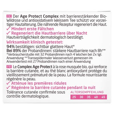 Die Glättende Nachtpflege Wildrose & Weißer Tee schenkt der Haut über Nacht Erholung. Sie stärkt die Hautbarriere und spendet langanhaltende Feuchtigkeit. Das Ergebnis ist sichtbar glattere Haut und ein frisches, erholtes Aussehen am Morgen. Der Age-Protect-Complex mit Bio-Wildrosenöl und antioxidativem Weißem Tee schützt wirksam vor den ersten Anzeichen der Hautalterung.