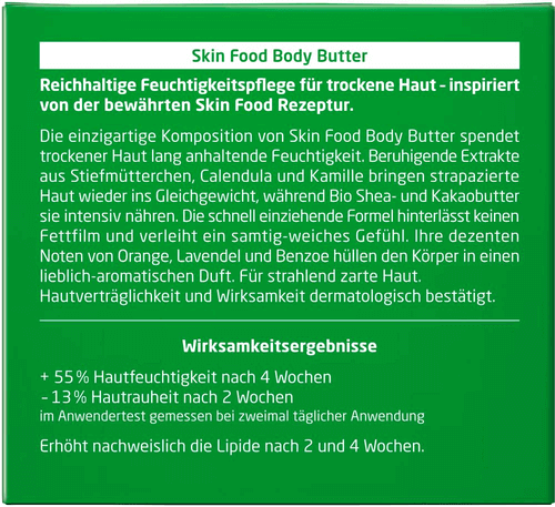 Die einzigartige Komposition der Skin Food Body Butter spendet trockener Haut lang anhaltende Feuchtigkeit. Fest und gleichzeitig sahnig zart verteilt sie sich wunderbar auf der Haut und zieht schnell ein. Beruhigende Extrakte aus Stiefmütterchen, Calendula und Kamille bringen strapazierte Haut wieder ins Gleichgewicht, während Shea- und Kakaobutter sie intensiv nähren. Für ein samtig-weiches Hautgefühl.
