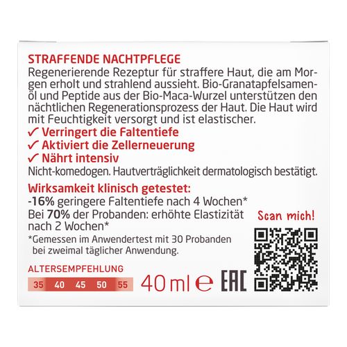 Bio-Granatapfelsamenöl und Peptide aus Bio-Maca-Wurzel unterstützen den hauteigenen Regenerationsprozess über Nacht. Nährt intensiv, verbessert die Spannkraft.